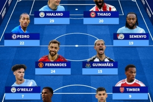 体育资讯4月3日讯 德国转会市场盘点了本赛季英超球员联赛参与进球最多阵,前场四重奏哈兰德、伊戈尔·蒂亚戈、若昂·佩德罗以及塞梅尼奥,B费、吉马良斯在列。