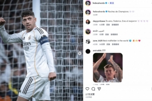 巴尔韦德也在赛后通过社媒晒出自己的振臂庆祝照,并配文:“欧冠之夜??”。