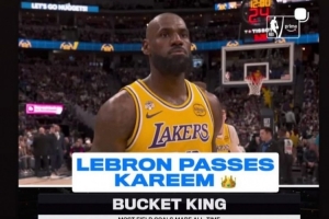 在首节最后时刻,詹姆斯转身后仰跳投命中,詹姆斯生涯命中数来到15838记,超越贾巴尔独占历史第一!